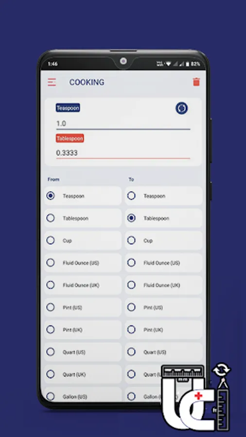 * Cooking (Teaspoon, tablespoon, cup, Fluid Ounce(US), Fluid Ounce(UK), Pint(US/UK), Quart(US/UK), Milliliter, Litre)