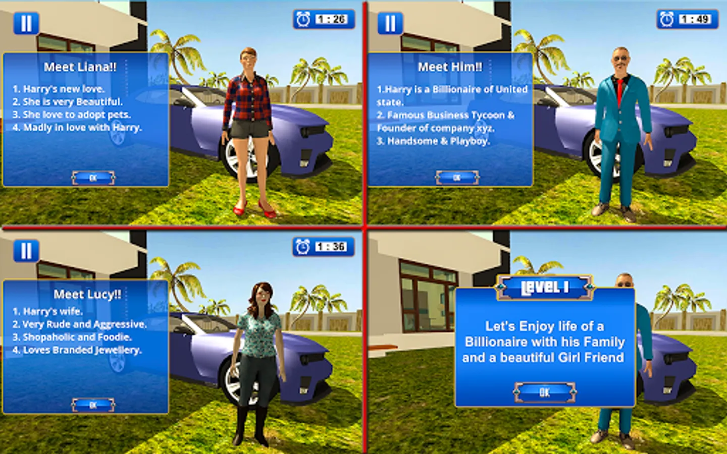 The concept of this luxury lifestyle of a billionaire dad and the businessman. His family members are totally three a son and a wife he has in his home. One day he saw a girl and he thinks to be a lover of her and he started dating and dancing in disco clubs, buy some jewelry and many more which you have in a rich simulator and virtual families. The businessman loved to attend the house party and enjoy the family travel. But one day when he was with his girlfriend the wife of super family man catch him red-handed and slapped him in the disco club after that he become a good businessman and a real husband and super virtual dad. Enjoy his family holidays on his private yacht with his virtual boy and loving wife.