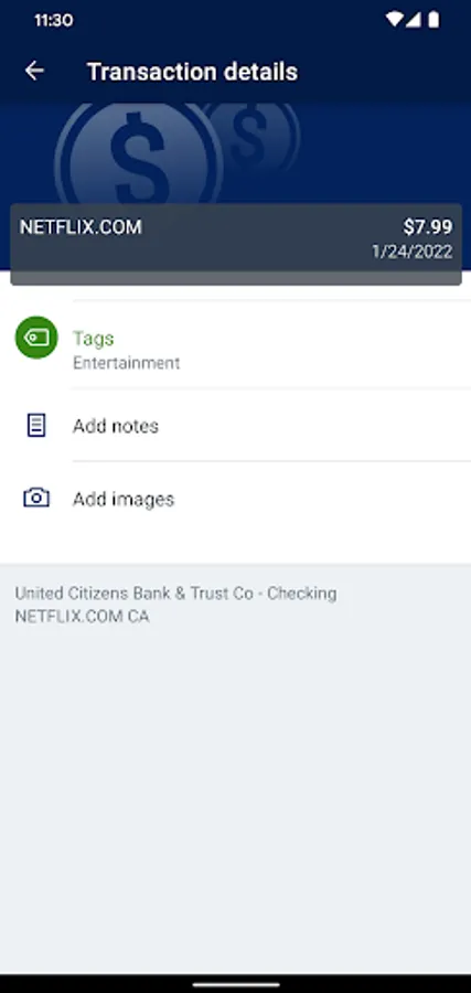 * Keep your transactions organized by allowing you to add tags, notes and photos of receipts and checks.