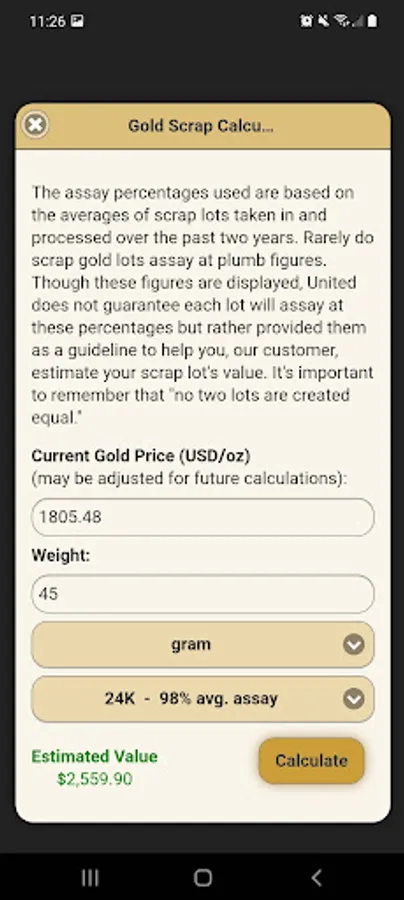 -- Estimate value of scrap gold or silver based on market price, karat and average assay percentages.
