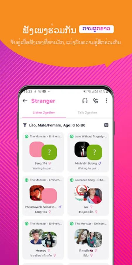 * ຊອກຫາ, ເພີ່ມໝູ່ເພື່ອຮ່ວມຟັງເພງ ແລະ ກະຊັບຄວາມສຳພັນໄປກັບຟັງຊັນ ຟັງເພງຮ່ວມກັນ