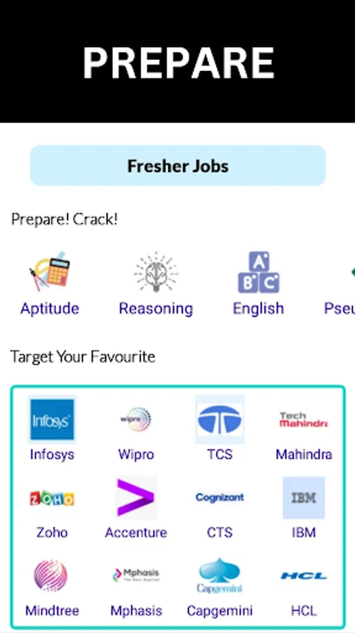 Grammar topics such as errors, synonyms, antonyms, cloze test etc provided. So you can easily maximize your communication score in Fresher IT job exams.
