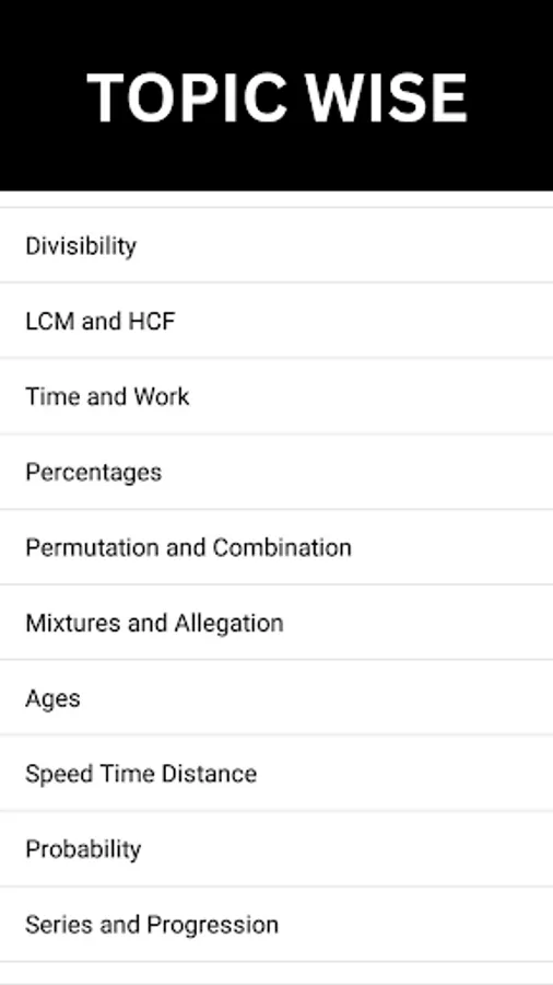 Here Various aptitude topics such as ages, profit and loss, permutation, simplification, LCM and HCF, Divisibility, Speed Time Distance etc are listed.