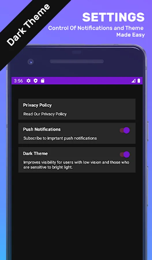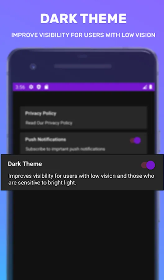 Dark theme improves visibility for users with low vision.