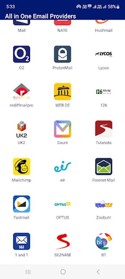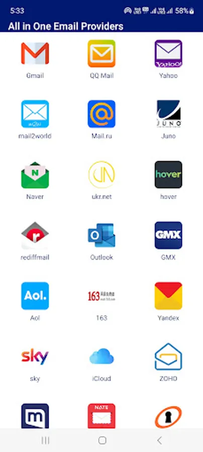 Just add your Microsoft Outlook, Mail.ru - Email App, Rediffmail , QQmail , hover, icloud, hushmail , juno , naver , nate , ukr , bt , lycos , 163, Yandex.Mail , ProtonMail - Encrypted Email, Tutanota - Free Secure Email, Mail2World, AOL, o2, GMX - Mail & Cloud, mail.com mail, Zoho Mail, WEB.DE, 1&1 Mail, Daum Mail accounts in our All Email Network.