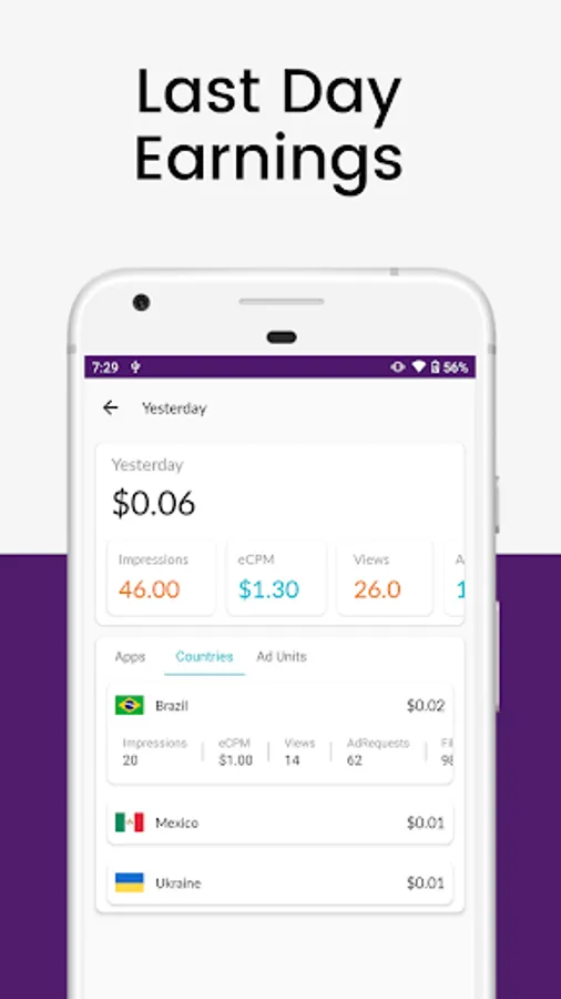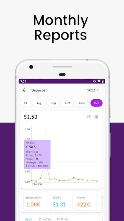 You get complete idea about you today's, yesterdays, this months & this years revenue in one look along with today's impressions, eCPM, ad requests and fill rate & earning distribution for each app.