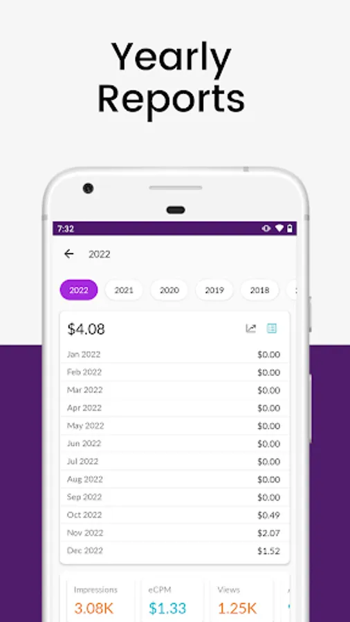 You can check yearly revenue of your ads in this section. Switch to any year and get monthly distribution of your total yearly revenue.