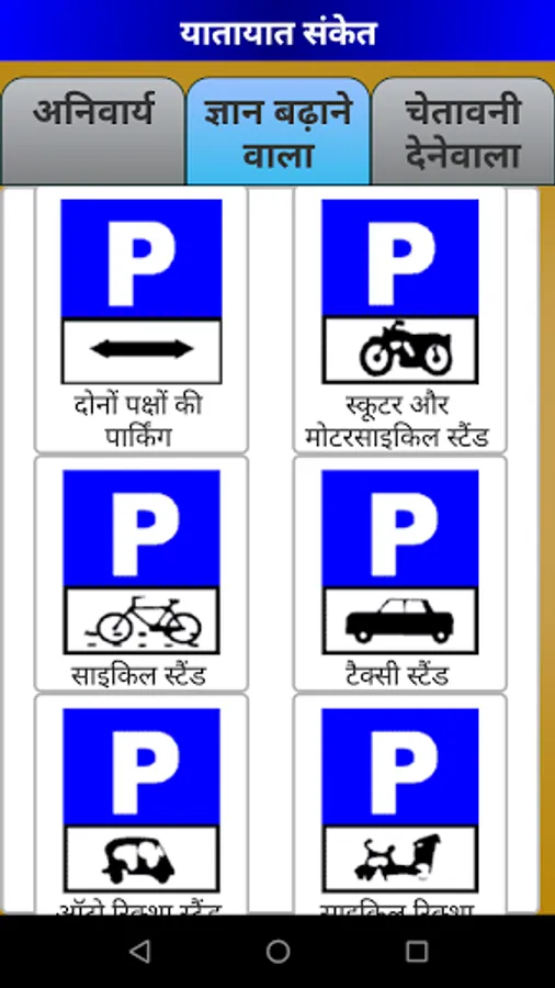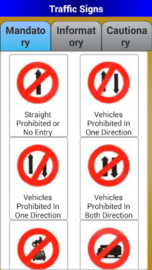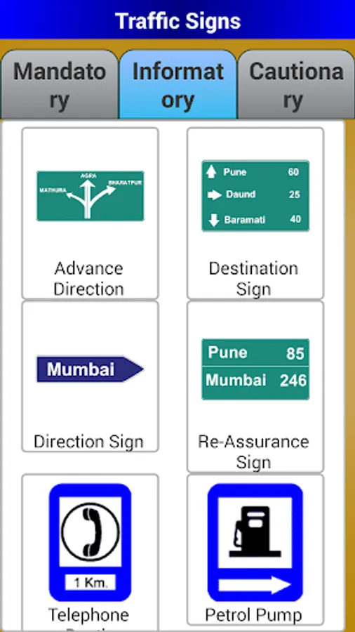 Sign images are shown for Mandatory/Regulatory Signs, Cautionary/Warning Signs and Information Signs.