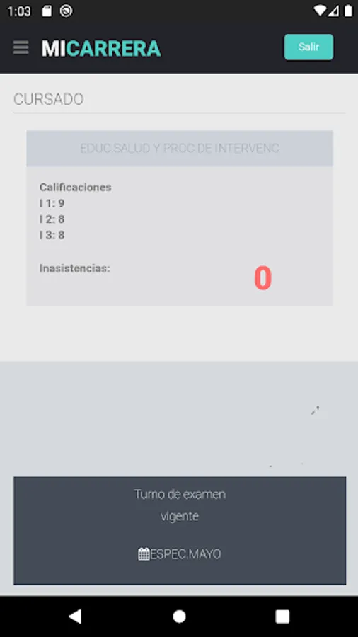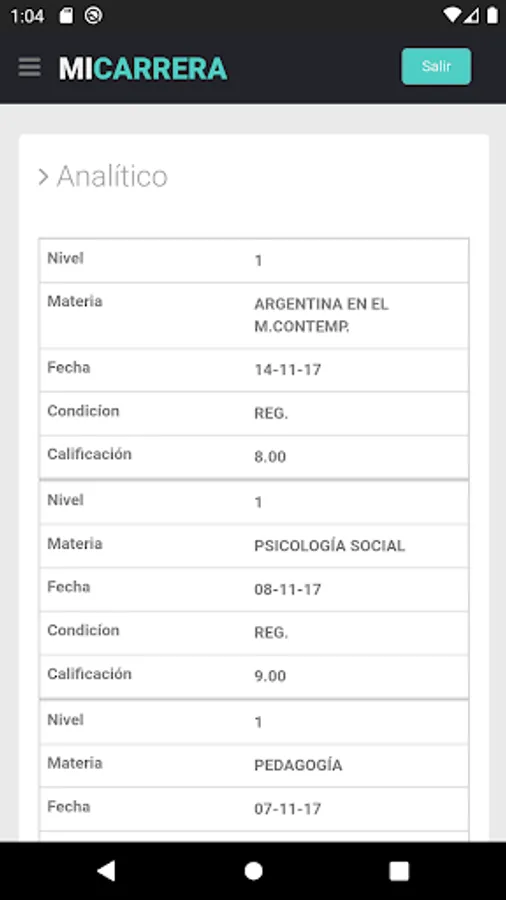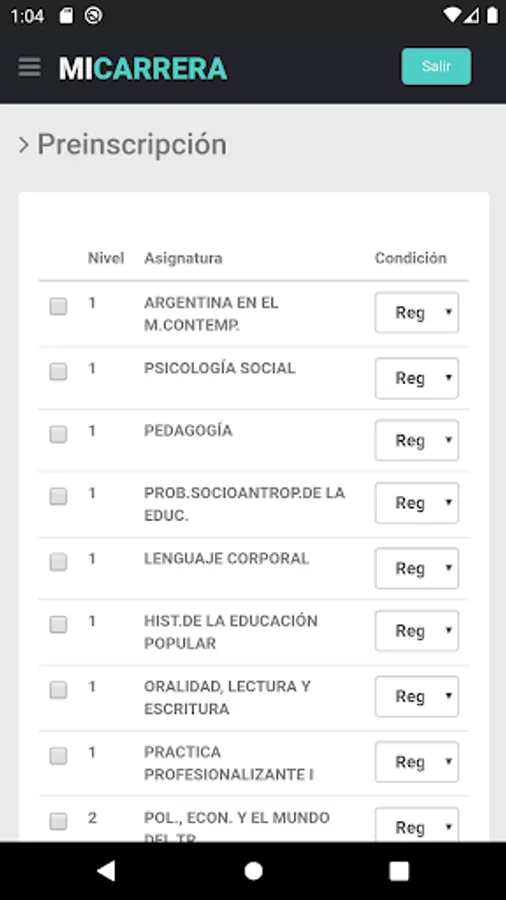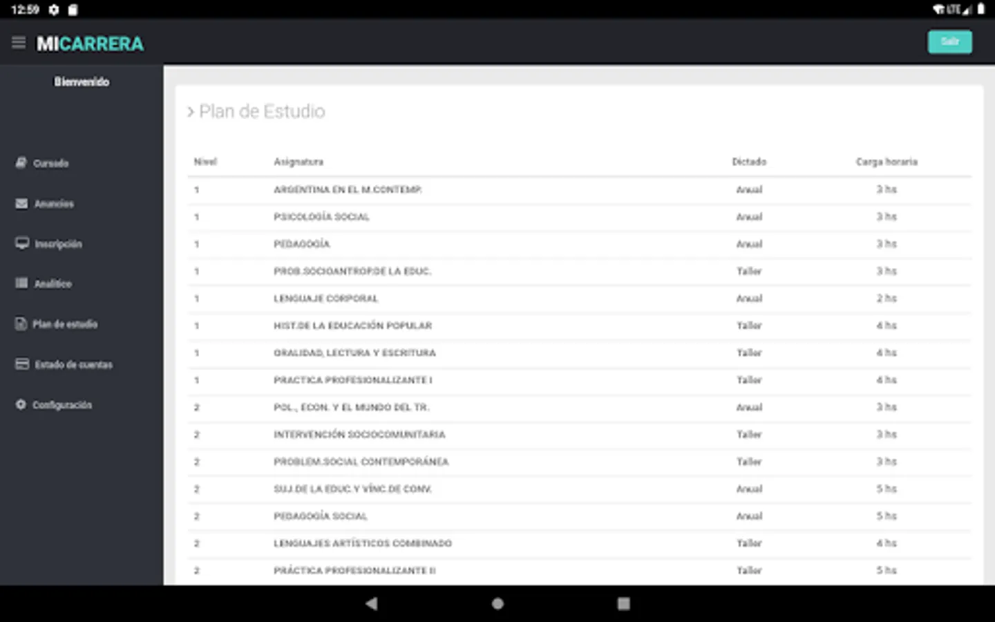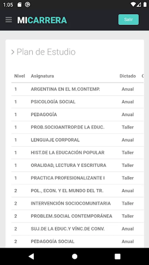 - View of the subjects of the plan that the student is taking