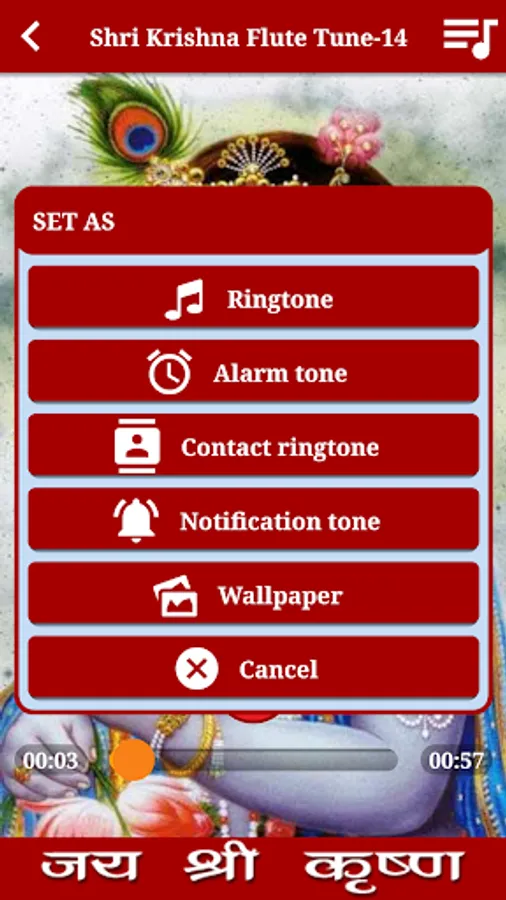 So download 'Krishna Flute Tunes & Sounds' App and easily set flute tunes, sounds and wallpapers as ringtone, alarm tone, contact ringtone, notification tone and wallpaper on device screen background.