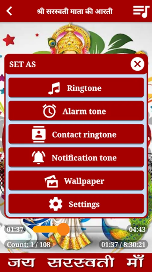 So download it and easily set high definition Goddess Shri Saraswatiji Ki Aarti, Chalisa and wallpapers as Ringtone, Alarm tone, Contact Ringtone, Notification tone and wallpaper.