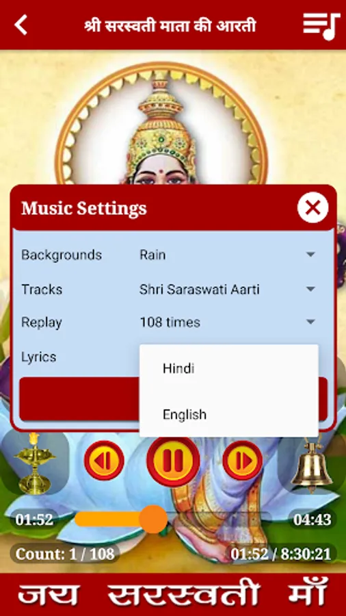 ★ Repeat Aarti & Chalisa for ∞, 1, 11, 21, 51, 108 times from settings button -> music settings.