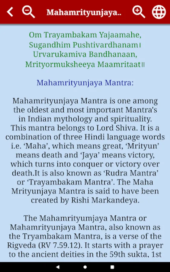 Mahamrityunjaya Mantra is one among the oldest and most important Mantra's in Indian mythology and spirituality. This mantra belongs to Lord Shiva. It is a combination of three Hindi language words i.e. ‘Maha’, which means great, ‘Mrityun’ means death and ‘Jaya’ means victory, which turns into conquer or victory over death.It is also known as ‘Rudra Mantra’ or ‘Trayambakam Mantra’. The Maha Mrityunjaya Mantra is said to have been created by Rishi Markandeya.