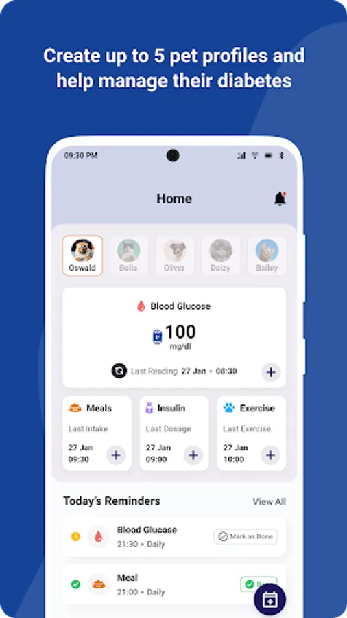 - Set personalised reminders to stay on top of your pet’s blood glucose levels, medication, food and exercise – whatever you need to manage your pet’s diabetes.