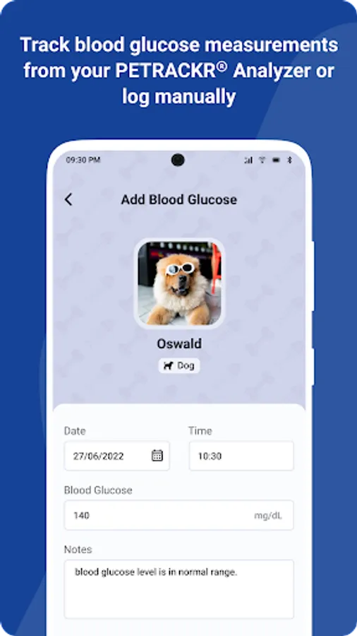 - Link to your PETRACKR® Blood Glucose Analyzer so all blood glucose measurements are transferred to the PETRACKR® App