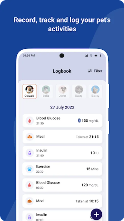 - All activities (blood glucose measurements, insulin doses, meals and exercise) are automatically logged to your pet’s Logbook.