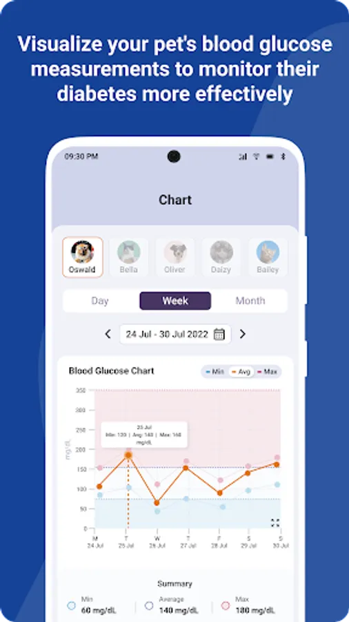 - Visualise your Pet’s blood glucose measurements in the form of colourful charts over daily, weekly or monthly timeframes. This allows you to quickly and clearly identify whether your pet’s blood glucose is in the appropriate range and identify any trends. Summary statistics of your pet’s minimum, maximum and average blood glucose results as well as the number of measurements in range, below range and above range are also provided.