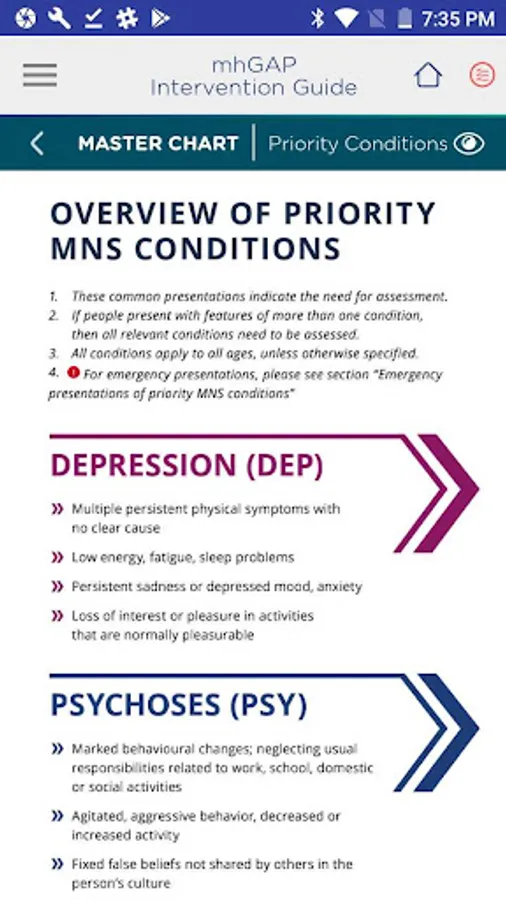 mhGAP-IG 2.0 App (e-mhGAP) is the official e-version of the World Health Organization’s mhGAP-Intervention Guide for mental, neurological and substance use disorders in non-specialized health settings Version 2.0. The mhGAP-IG 2.0 App is a valuable tool to scale up services for people with MNS conditions and their families.
