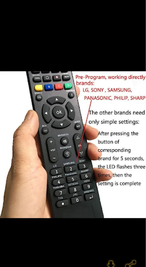 • Brand setting method: universal tv remote guide after pressing the corresponding brand button for 5 seconds, the LED flashes for the third time, and the setting is. universal tv remote guide completed.(Including an instruction manual)