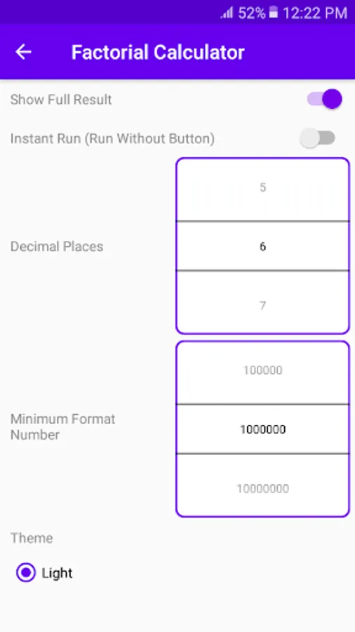 Note: if the result is more than 100,000 digits, displaying it could slown down your tasks. You can turn off showing full result on Settings to keep the app smoothly if you don't need them.