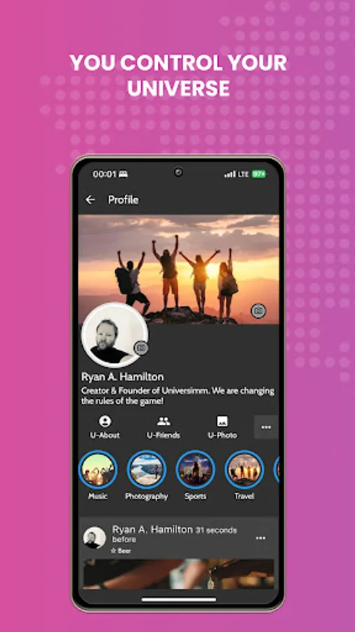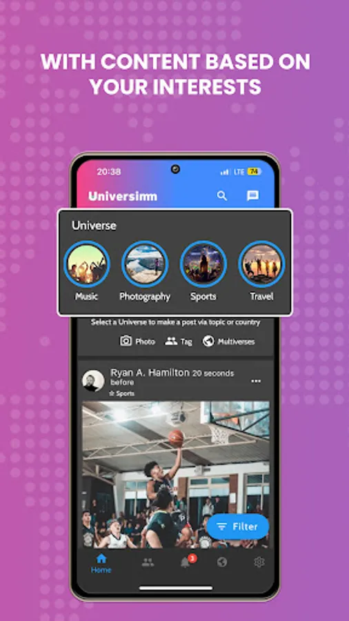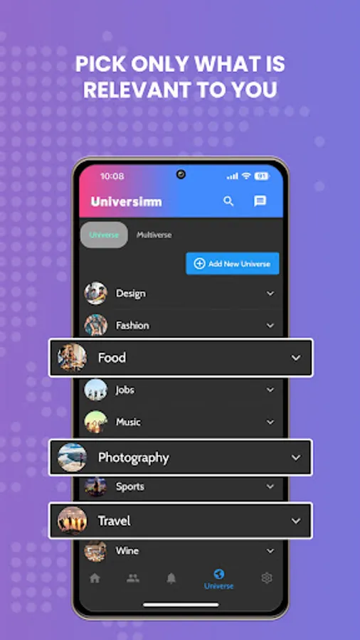 With UNIVERSIMM - you'll experience a refreshing departure from annoying, repetitive and irrelevant ads. Curate content based on your interests, connect with people, who follow the same interests as you and enhance your personal growth through a diverse array of individuals who can inspire and motivate you.