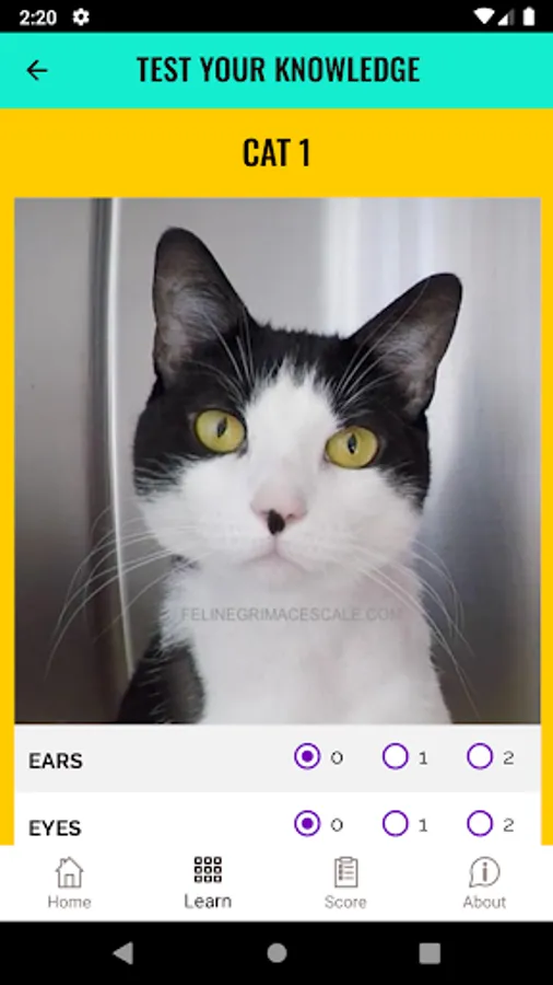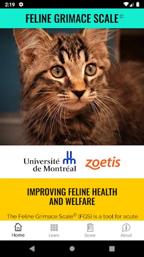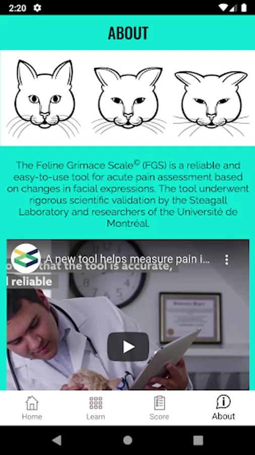 The Feline Grimace Scale App teaches users about this tool and facilitates real-time pain scoring in cats. It has several drawings and images to facilitate learning, including a practice session. This App can be used by any person.