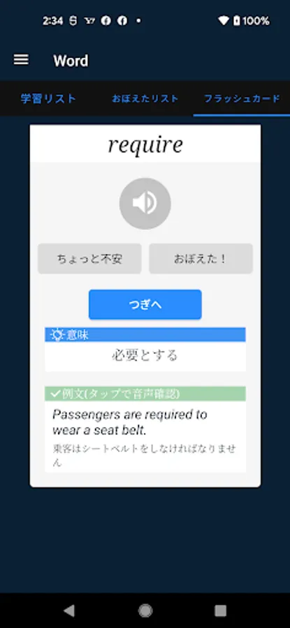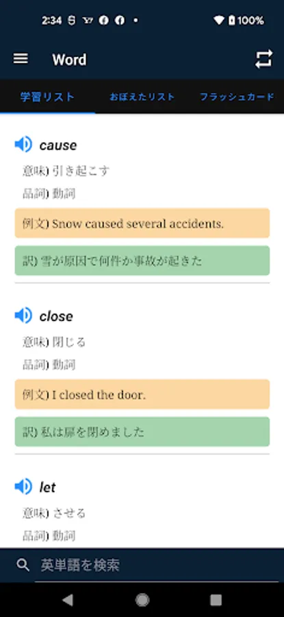 The app will automatically create a flashcard from your study list, so listen to it and see it to learn English words! When you're done, learn again and again with the RESET ALL button at the top of the list you remembered! The [Number of times you remembered everything] in your learning history will increase by one.