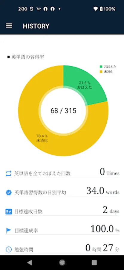 You can check a list of various numerical values such as the progress graph of the current English words, the learning time, how many times you have learned all of them, and the achievement rate of the daily target number of English words you have learned so far.
