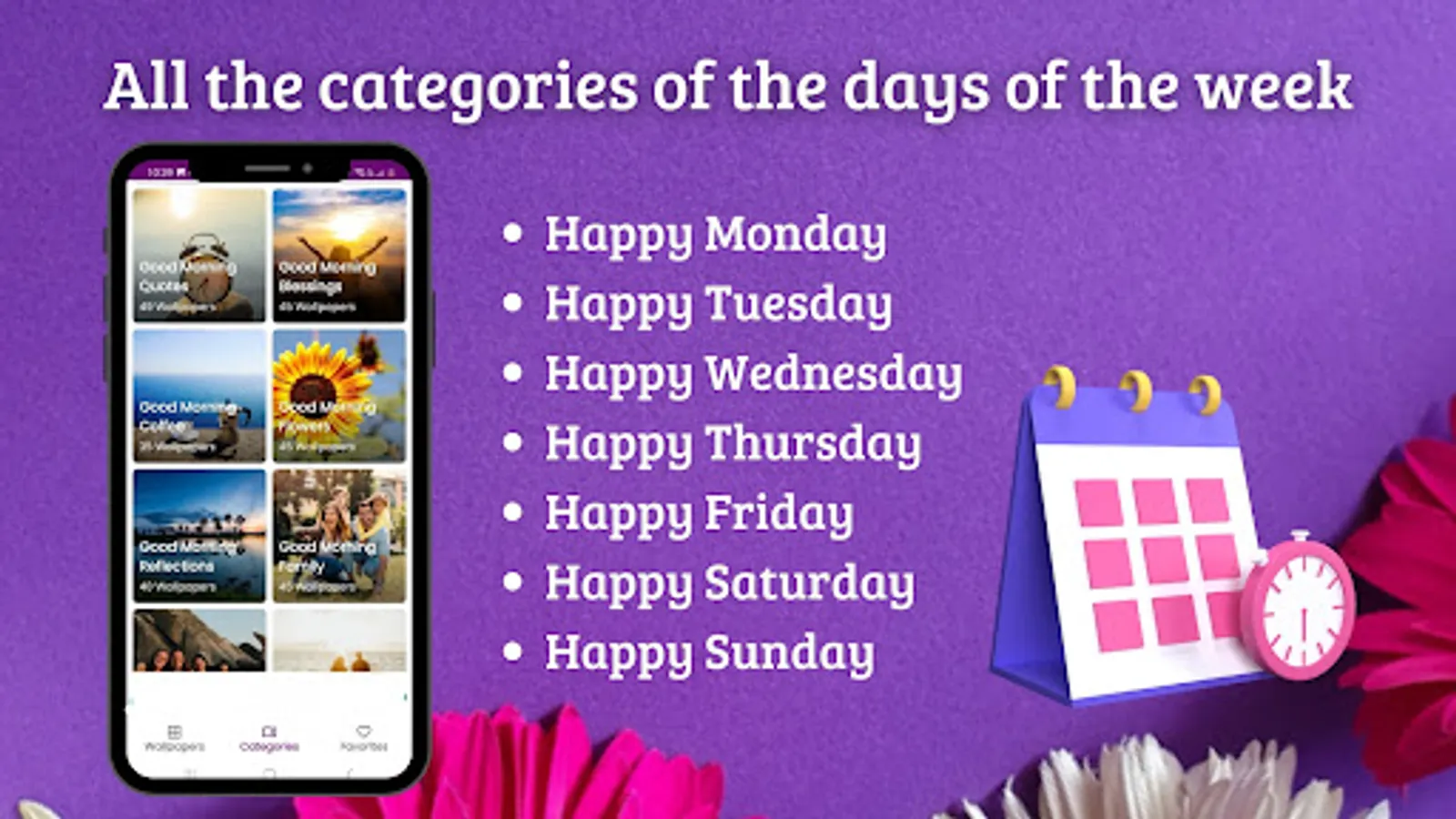 You will find categories related to good morning, good afternoon, good evening, good night and of course the days of the week, some examples of our categories are good morning with coffee, good morning with blessings, good afternoon with flowers, good afternoon my love, good night family, sweet dreams, among many more.