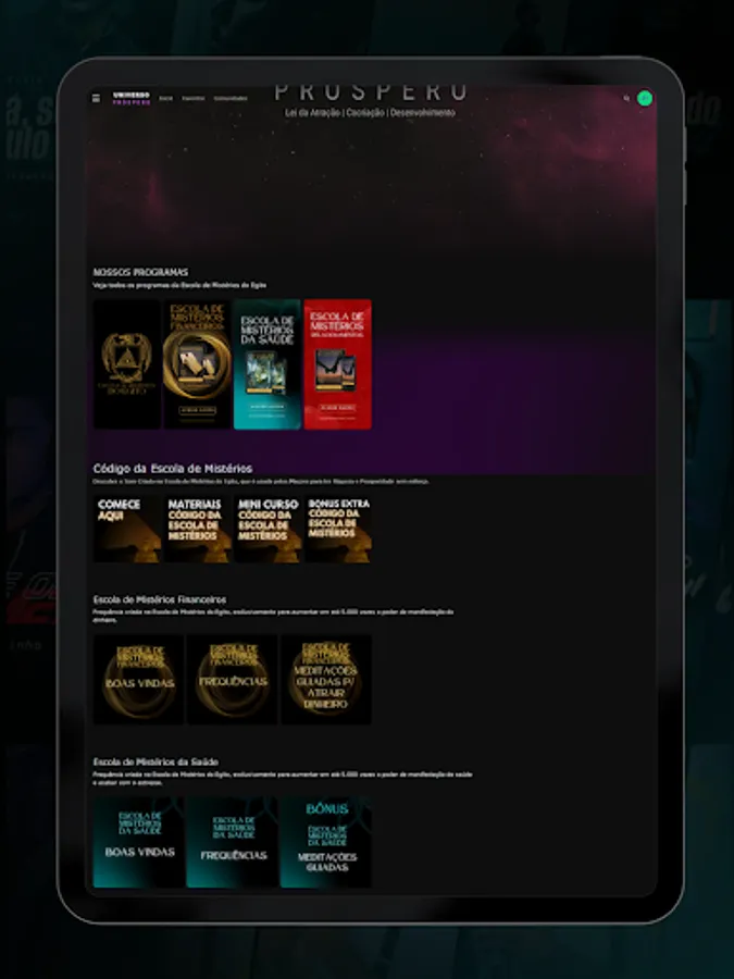 In the Universo Próspero app, you will have access to all the training provided by the Universo Próspero company, related to the law of attraction, co-creation of reality, mental and spiritual development, as well as tools to raise your vibrational frequency.