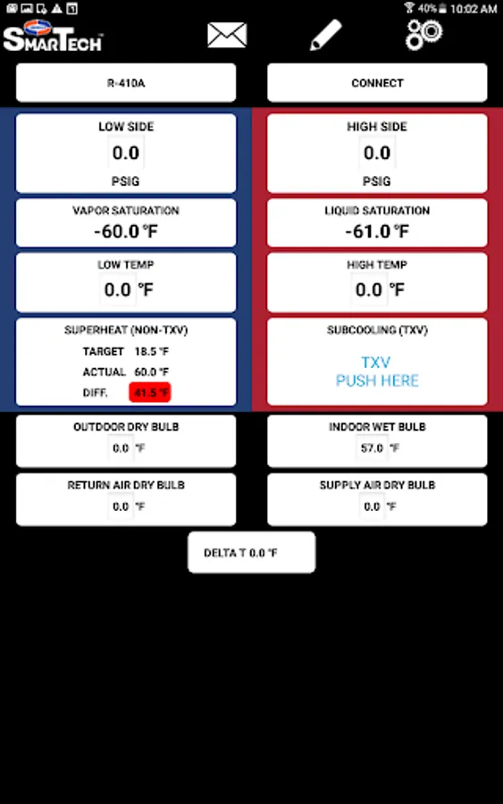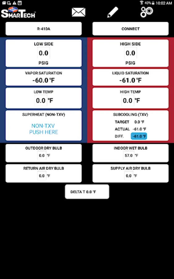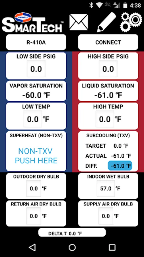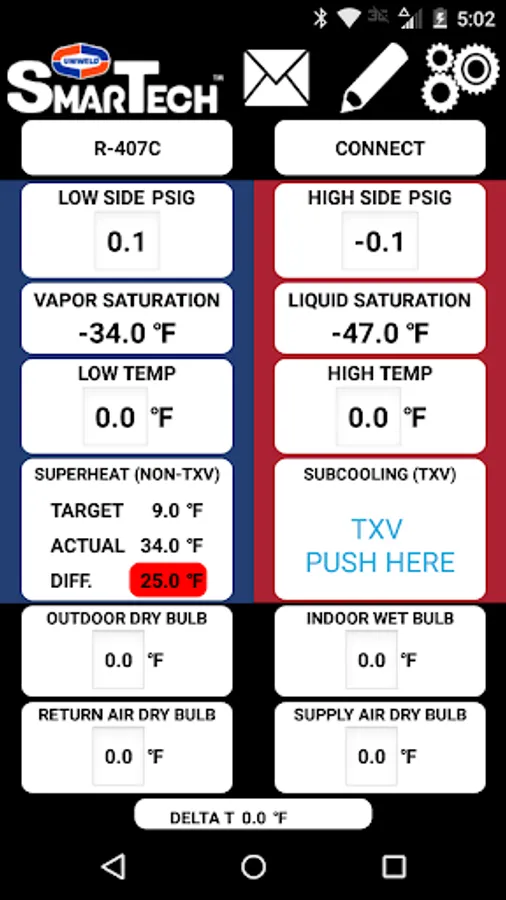 The Uniweld SmarTech™ Digital Manifold App communicates with your SmarTech™ Digital Manifold to clearly display professionally accurate pressure and temperature readings in the palm of your hand. Monitor target and actual Superheat and Subcooling calculations in real-time, as pressure and temperature readings fluctuate. Choose from 109 different refrigerant types and create a custom list of your most commonly used refrigerants.