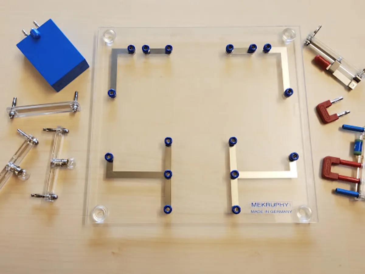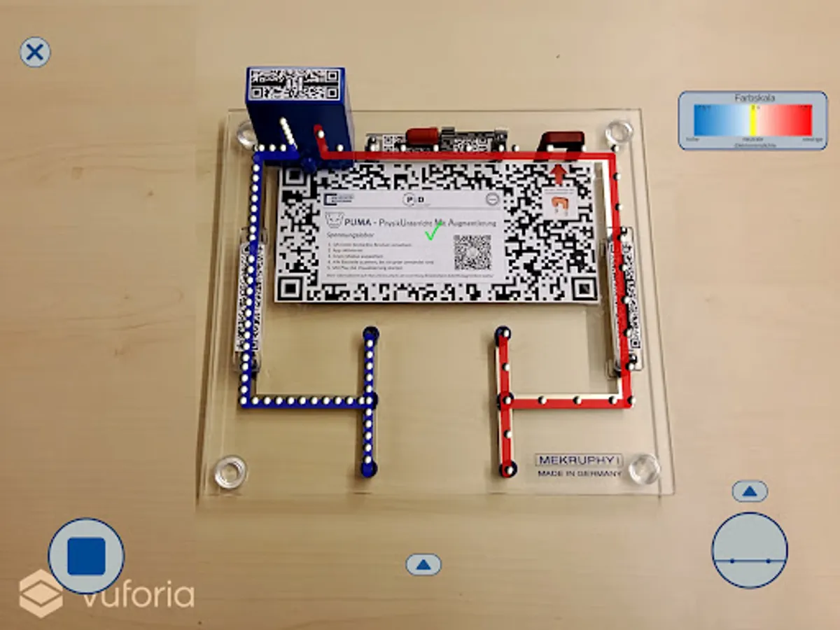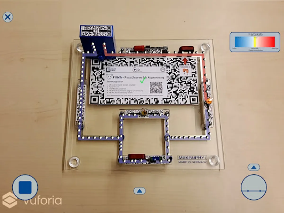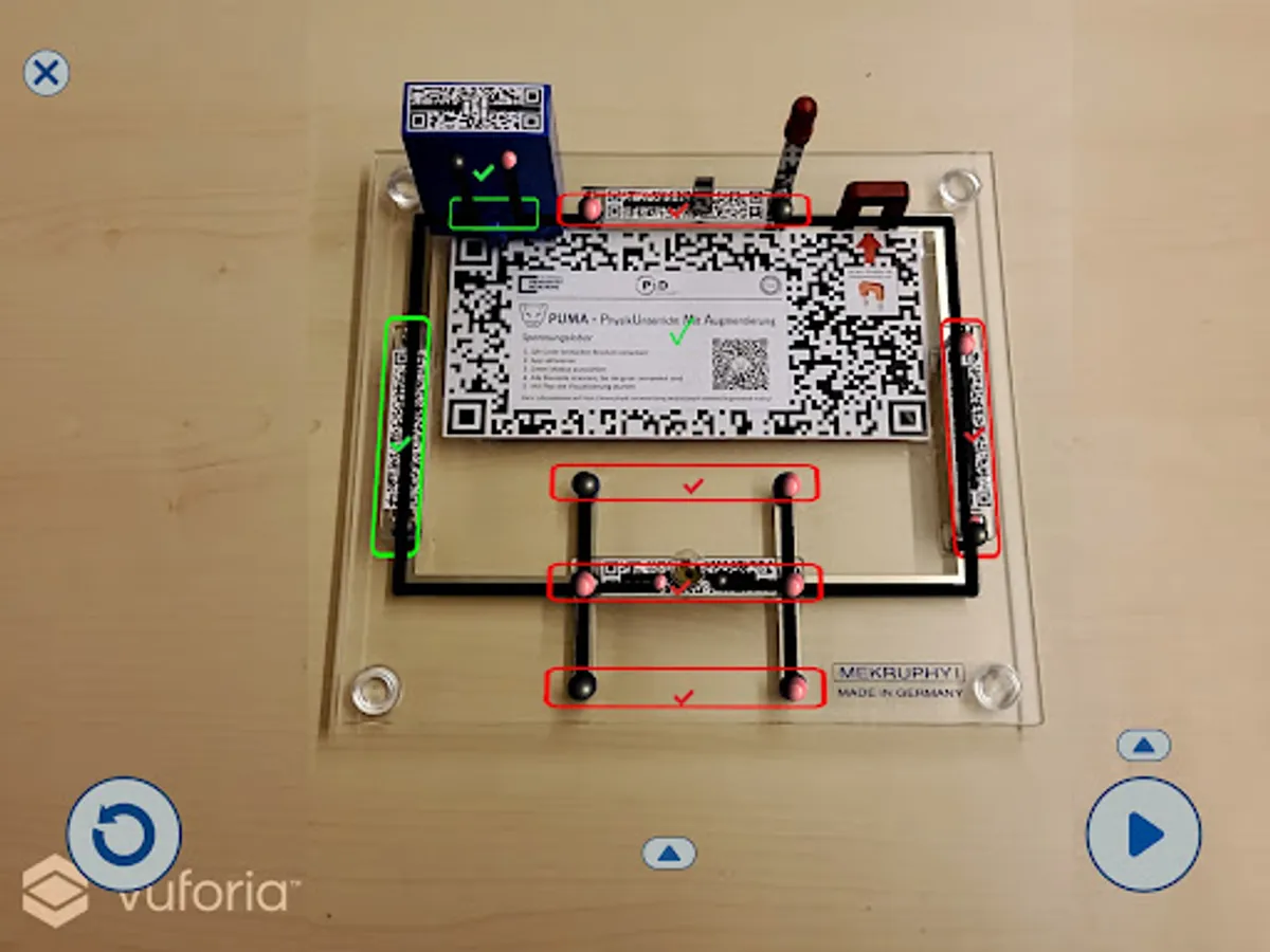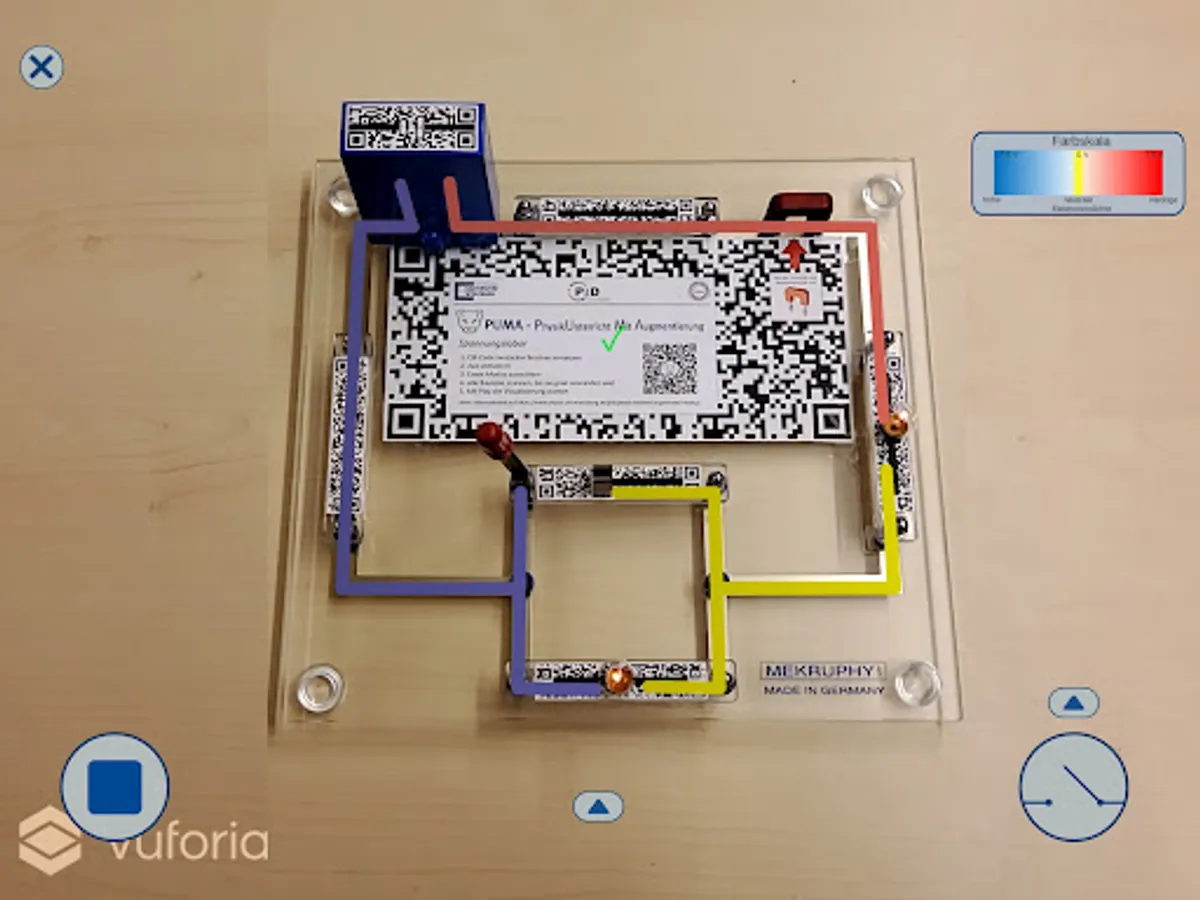 The application is intended to support students in correctly modeling the electric current. To do this, she links observations made in the real experiment (lamp does not light up/lights up little/brightly, measured current values in the parallel circuit, ...) with corresponding physical model ideas projected onto the experiment by AR. In an intuitive way, this combines, for example, the observation of a brightly lit lamp in the parallel strand of the small resistor with the visualization of a higher current strength there due to faster-moving virtual electrons.