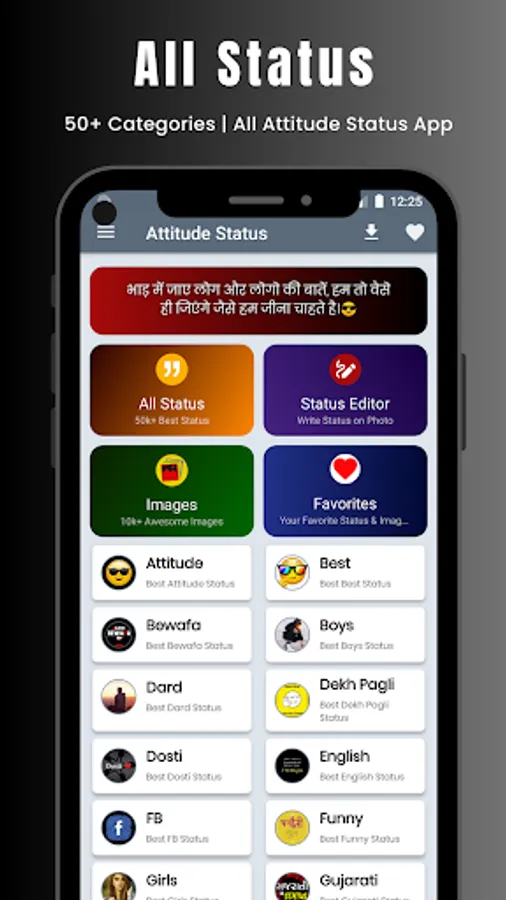 Hindi Attitude Status Shayari App ever to create an amazing status with your photo and name. The best app for you, brings you the latest status and shayari images for best Attitude Status in Hindi 2023 for your entertainment.