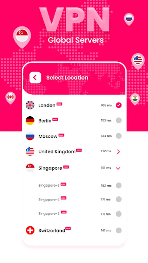 -Global locations There are multiple locations such as the United States, Germany, India, Canada, Singapore, the United Kingdom, etc. No matter where you are, change locations to protect privacy.