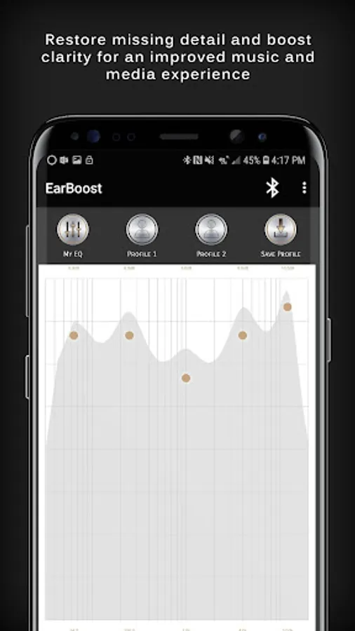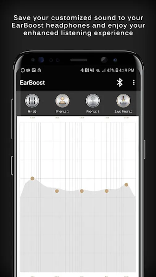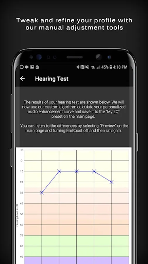Use the built-in hearing test tool and our proprietary algorithm to create your initial adaptive audio profile, then tweak the curve further with our manual tools before uploading it to your EarBoost-enabled headphones.