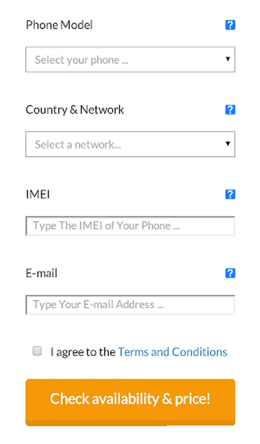 2. Fill in the information about your phone: model, the country & network you originally bought your phone from and the IMEI of your phone (dial *#06# to find the IMEI). Payment can be done by choosing one of the following methods: Credit Card, PayPal, Skrill or CoinBase.