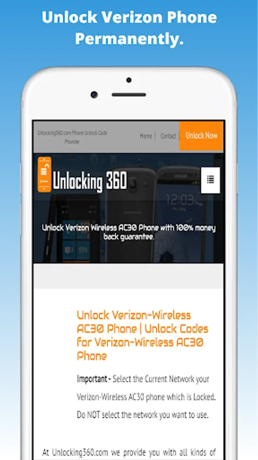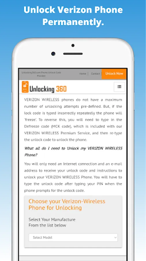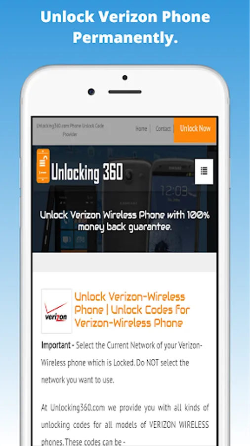 We provide VERIZON unlocking codes worldwide, all you have to do is enter the unlock code provided by Unlocking360.com and your phone will be unlocked forever.