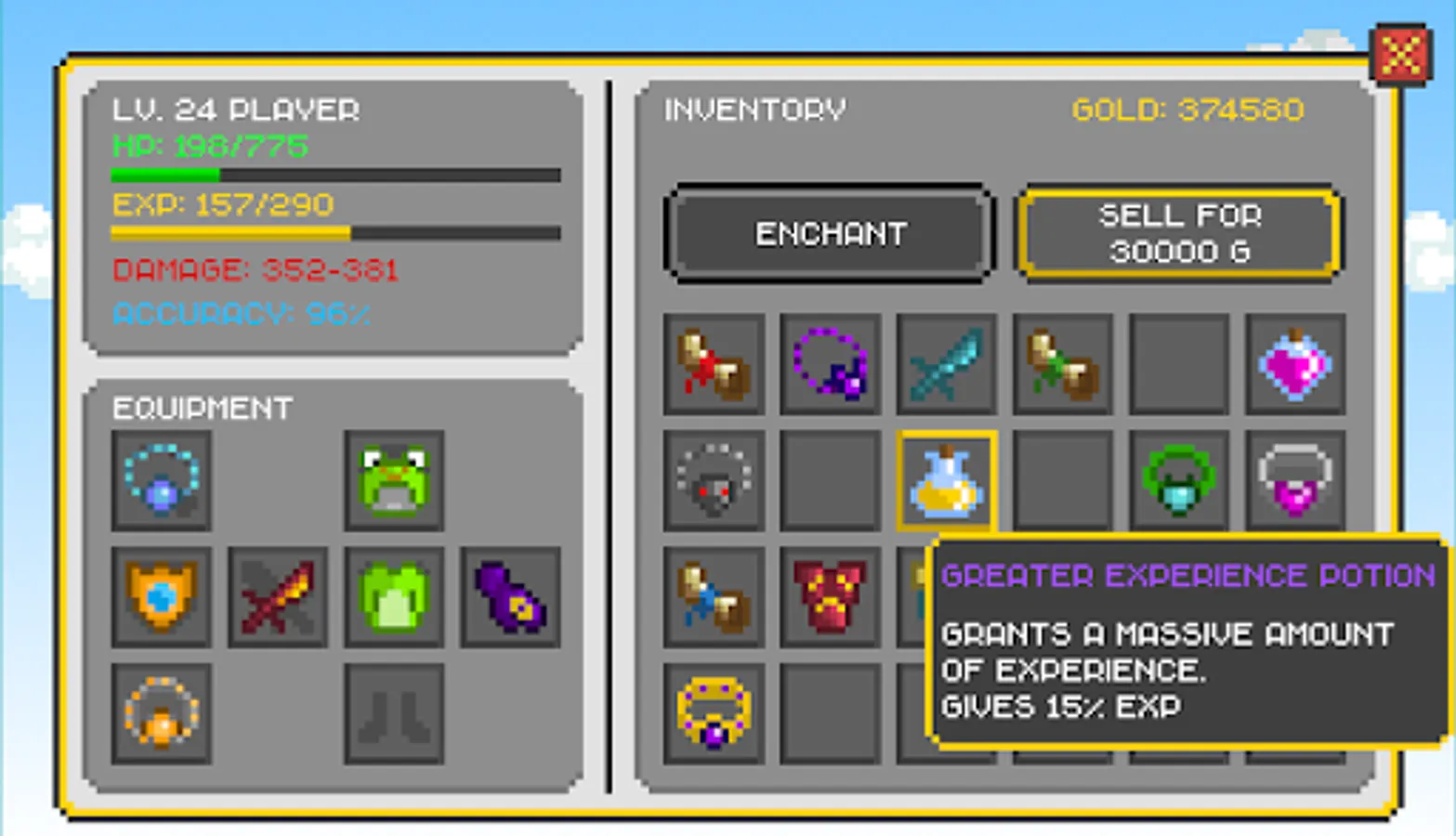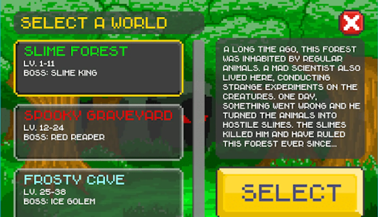 The player ventures and battles monsters in maps with various themes. Currently there are three available worlds all with 10+ levels in each world. In these maps, the player will have to defeat monsters and find a star tile to complete the level. Monsters may drop items that can improve the player's strength. These items may be sold in the shop for gold or enchanted to increase their power. There are currently 100+ items dropped by monsters and sold in the shop.