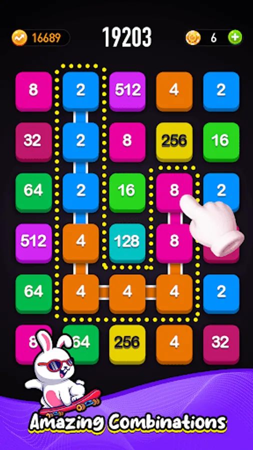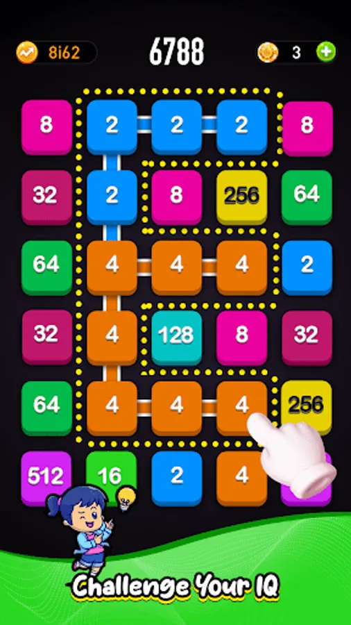 1. Connect the same number squares in any one of the multiple directions (up, down, left, right or diagonal) on the board to merge more advanced square numbers.