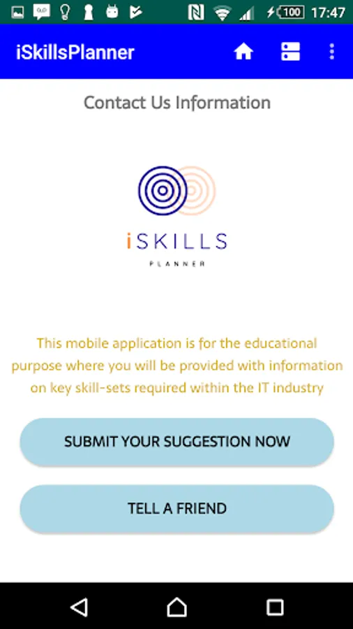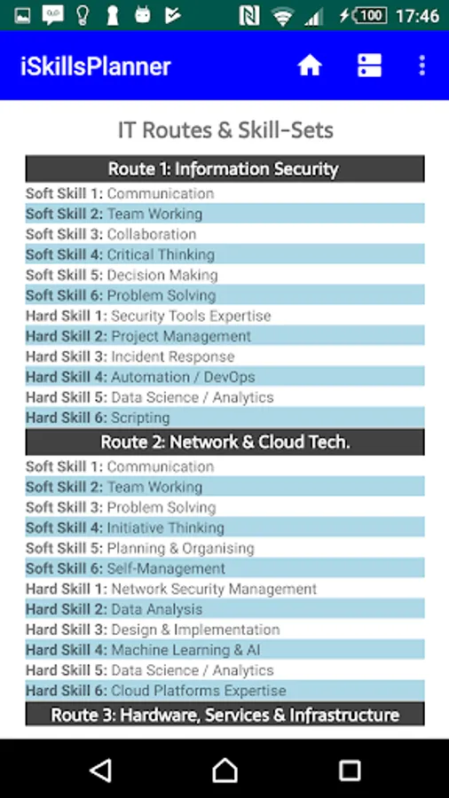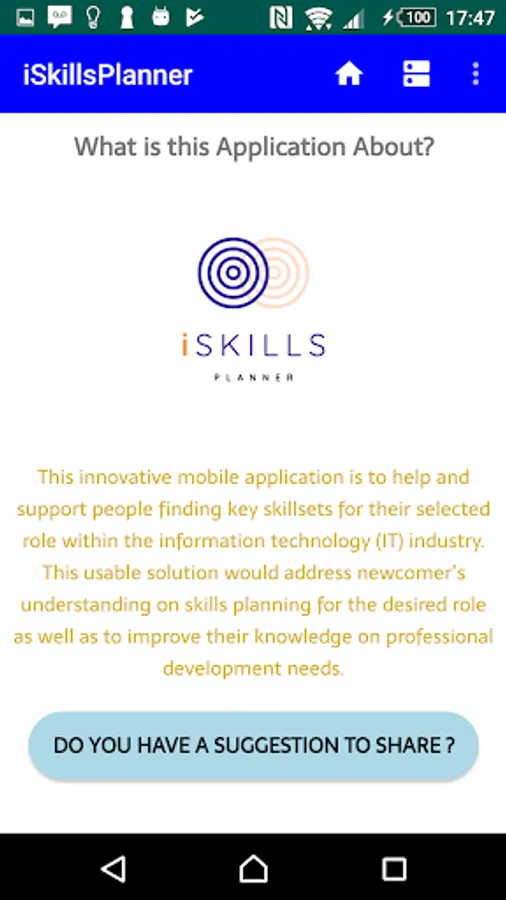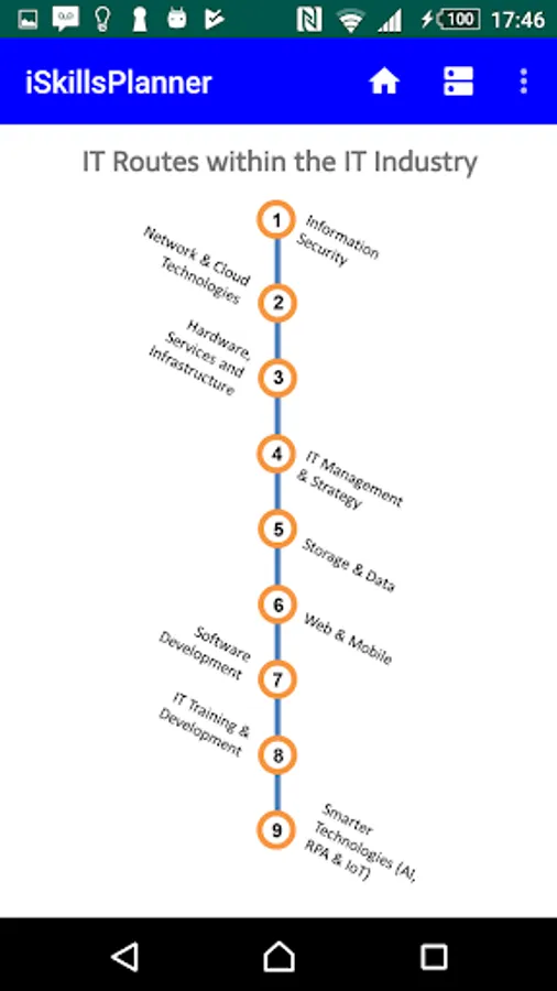 The mobile application is to help and support people finding key skill-sets for the selected role within the information technology (IT) industry. This usable solution would address newcomer's understanding on skills planning for the desired role as well as improve their knowledge on professional development needs.