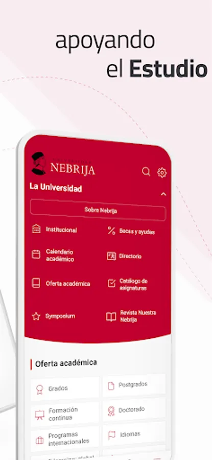 This is the official Nebrija University App: accessible, free of advertising, without transferring data to third parties and with functionalities for everyone: students, teachers, researchers, civil servants, alumni, graduates, future students and guests. Everyone will find what they are looking for in their profile: