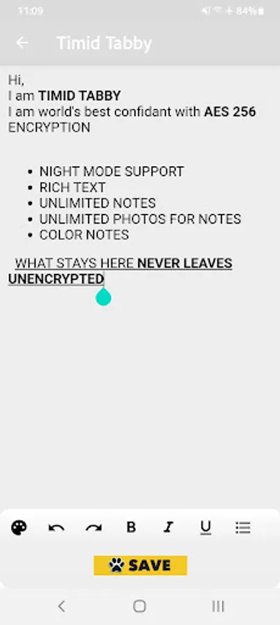 Since this app encrypts your notes with AES 256, there is no chance of recovering your data if you ever forget the password you used to encrypt your notes.
