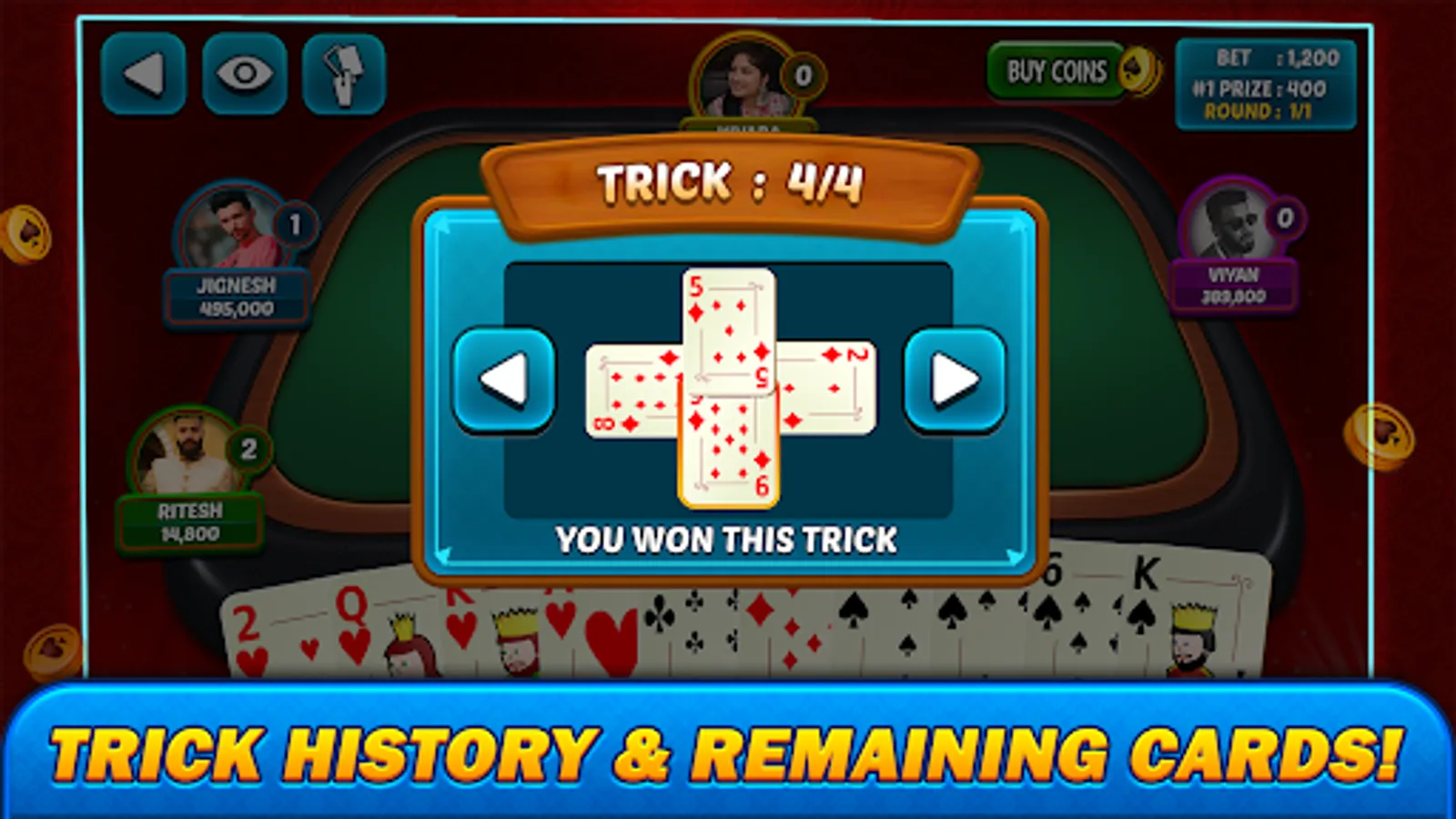 *TRICK HISTORY :- If you want to know which past trick won by which user and which cards were thrown to that trick, for that this feature will help you.