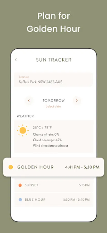 • A magic hour sun tracker to help you plan your shoots for the best golden hour light