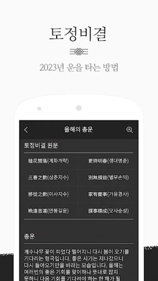 Based on the original text of Tojeong Lee Ji-ham, it provides this year's total luck, monthly luck, love luck, wealth luck, and job luck through a modern reinterpretation.
