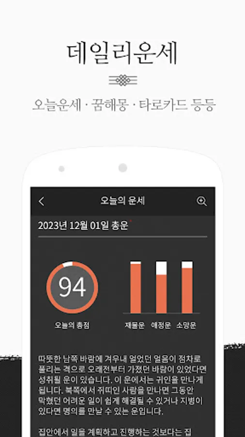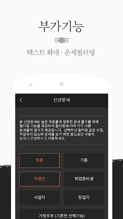 Through filtering of unmarried, married, office workers, entrepreneurs, and job seekers, the same results are reinterpreted according to the situation, and overall luck, work luck, business luck, love luck, financial luck, etc. are provided.