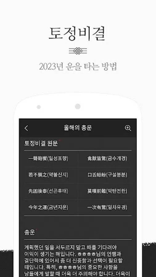 Based on the original text of Tojeong Lee Ji-ham, we provide this year's total luck, monthly luck, love luck, wealth luck, and job luck through a modern reinterpretation.