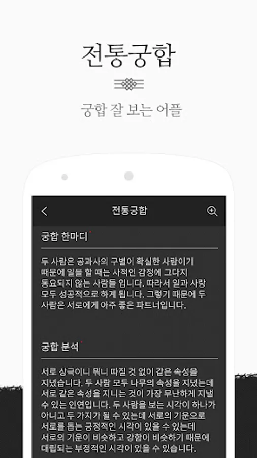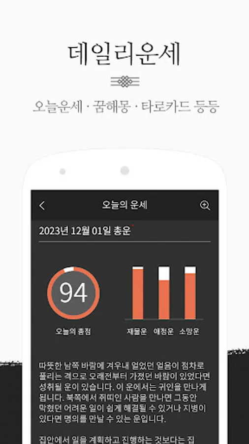 Through filtering of unmarried, married, office workers, entrepreneurs, and job seekers, the same results are reinterpreted according to the situation, and overall luck, work luck, business luck, love luck, and money luck are provided.