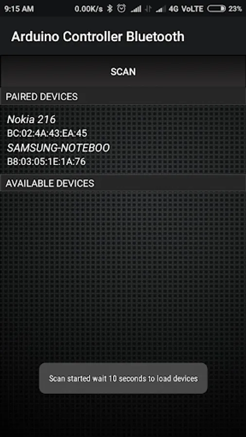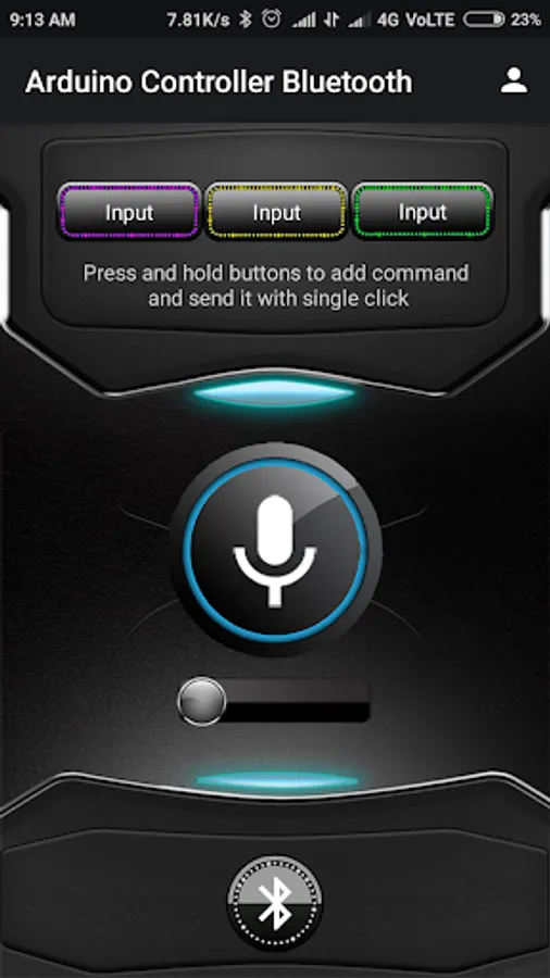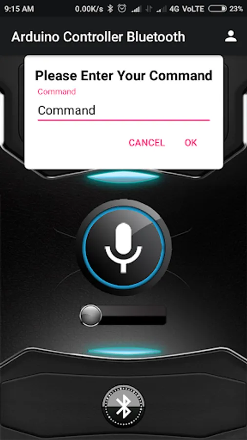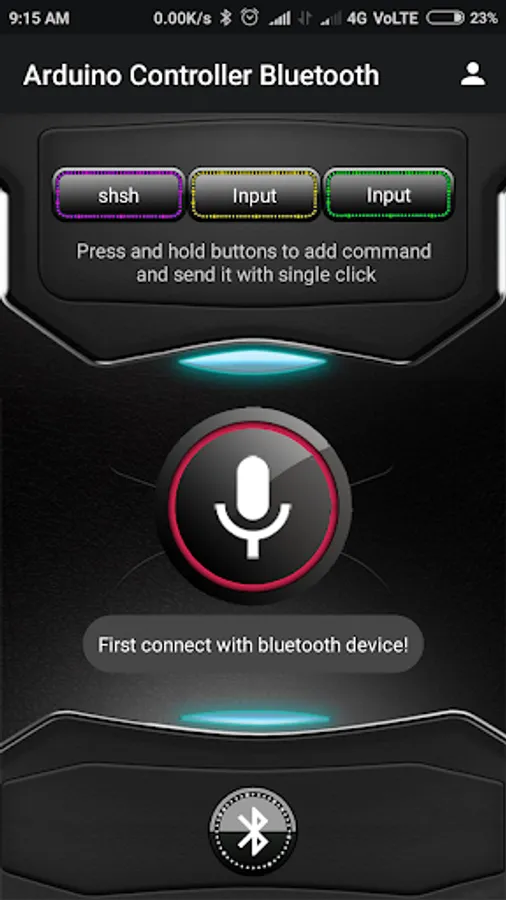 Run the app, search for your bluetooth module and connect. Once you are connected you will be able to send your own commands to your arduino board using the keyboard or some fancy buttons. Send command with your voice.