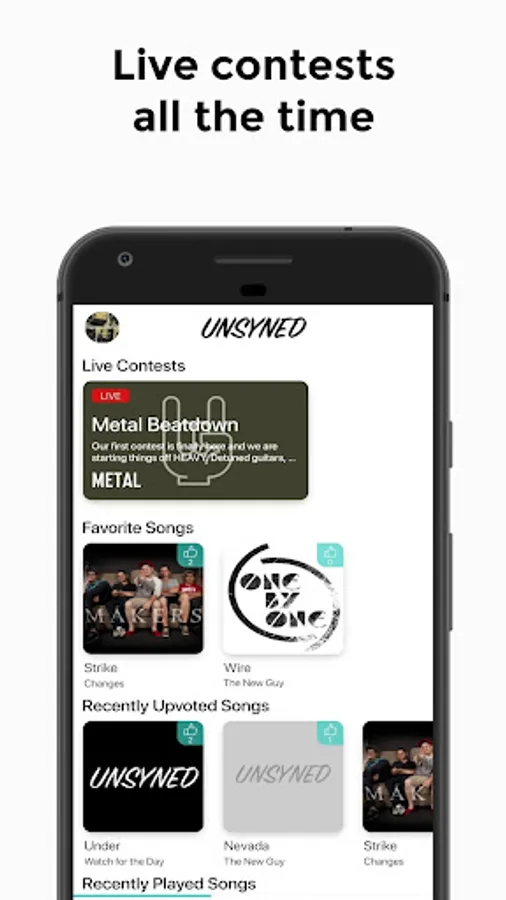 With Unsyned, you can submit your songs to music contests to reach new listeners. Compete with other artists and win prizes for having one of the top upvoted songs in a contest.
